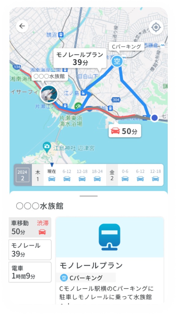 公共交通機関等を使った別ルートを選択したほうが効率よく移動できることを分かりやすく伝えます。