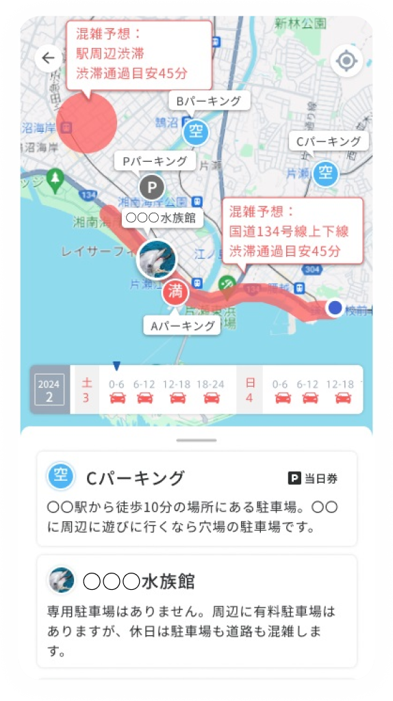 渋滞や混雑を利用者に知らせて近くの提携駐車場へ誘導します